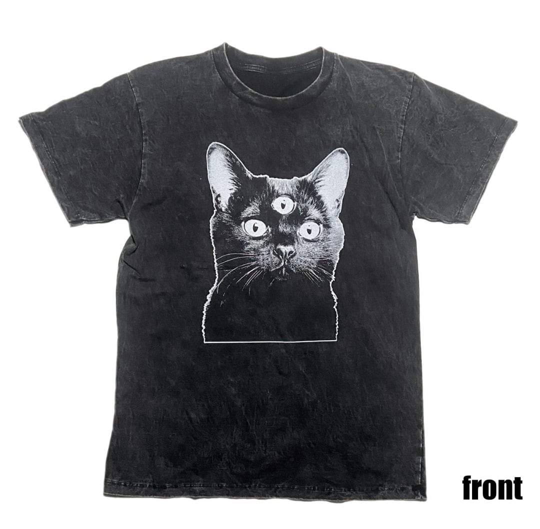 個性的な三つ目猫ちゃんのシルクスクリーンプリントが施されたTシャツになります。