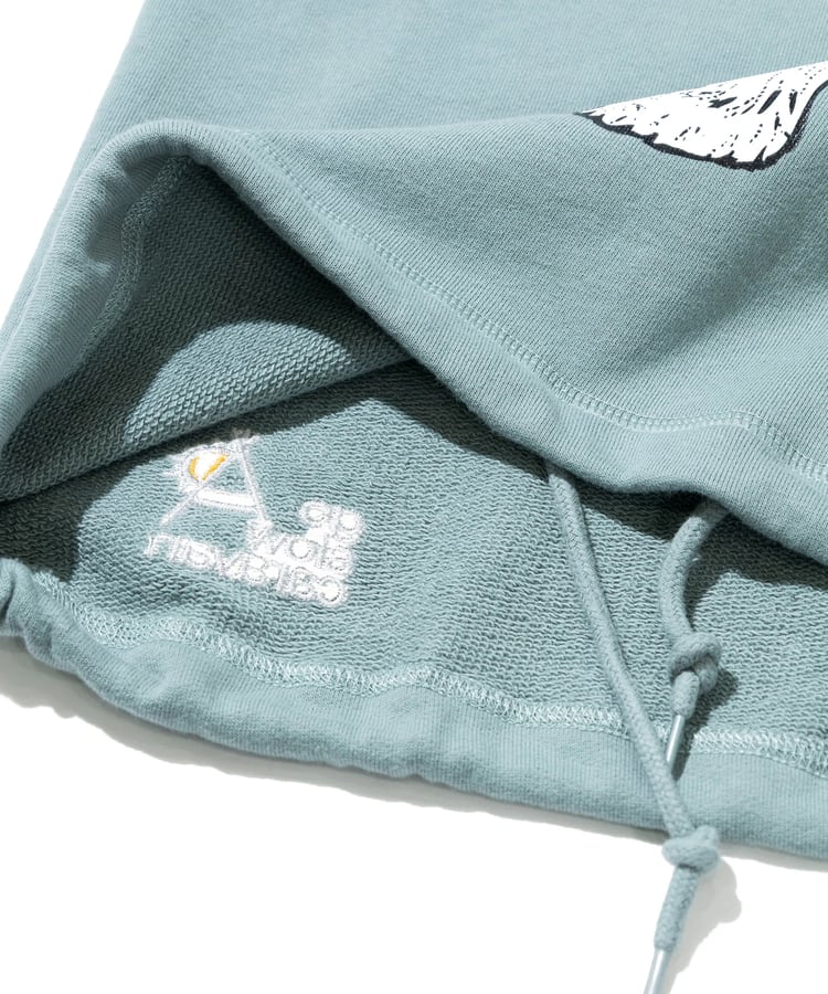 一般的なリブ裾タイプに比べてインナーに重ねてもゴワつきにくく、絞ることでシルエットアレンジも可能。フロントには、スキレットで焼いたアツアツのピザを頬張る“キャンパークマ”をプリント。黒インク部分にはジェルプリントを重ね、立体感のある多色ラバープリントで仕上げています。遊び心と存在感を兼ね備えた1枚です。