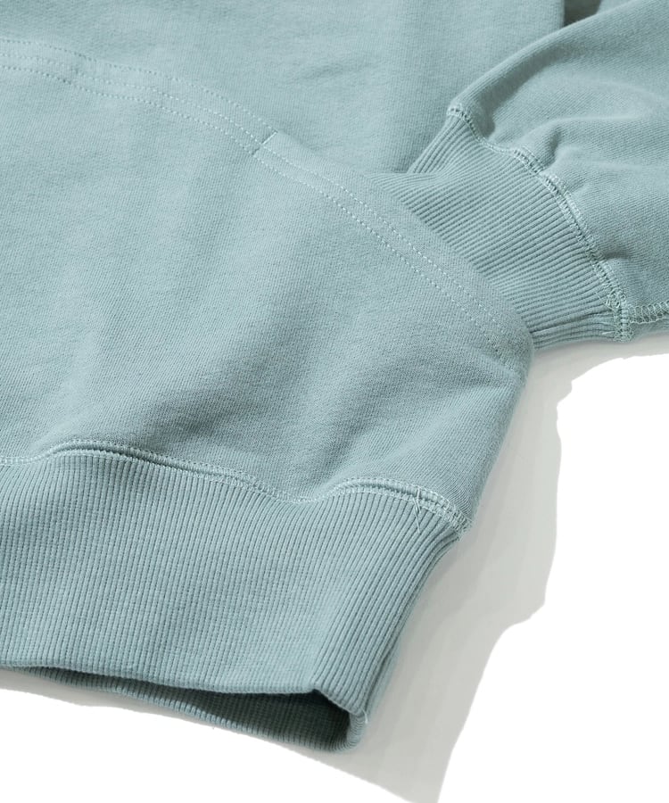 綿100%ヘビーウェイトの裏毛生地。表は空紡糸らしいガシッとした肌触りでありながら、裏のパイル面には太い裏糸を使用しているので空気を多く含みフワッと柔らかい着心地を実現。使い込むほどに風合いの増す生地。クラシック感のある長めのリブや3本針で丈夫な縫製などこだわりのディテールも取り入れた長くご愛用いただけるアイテム達です。