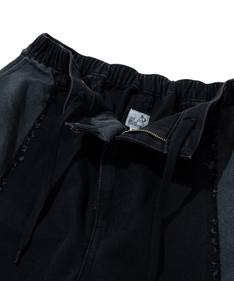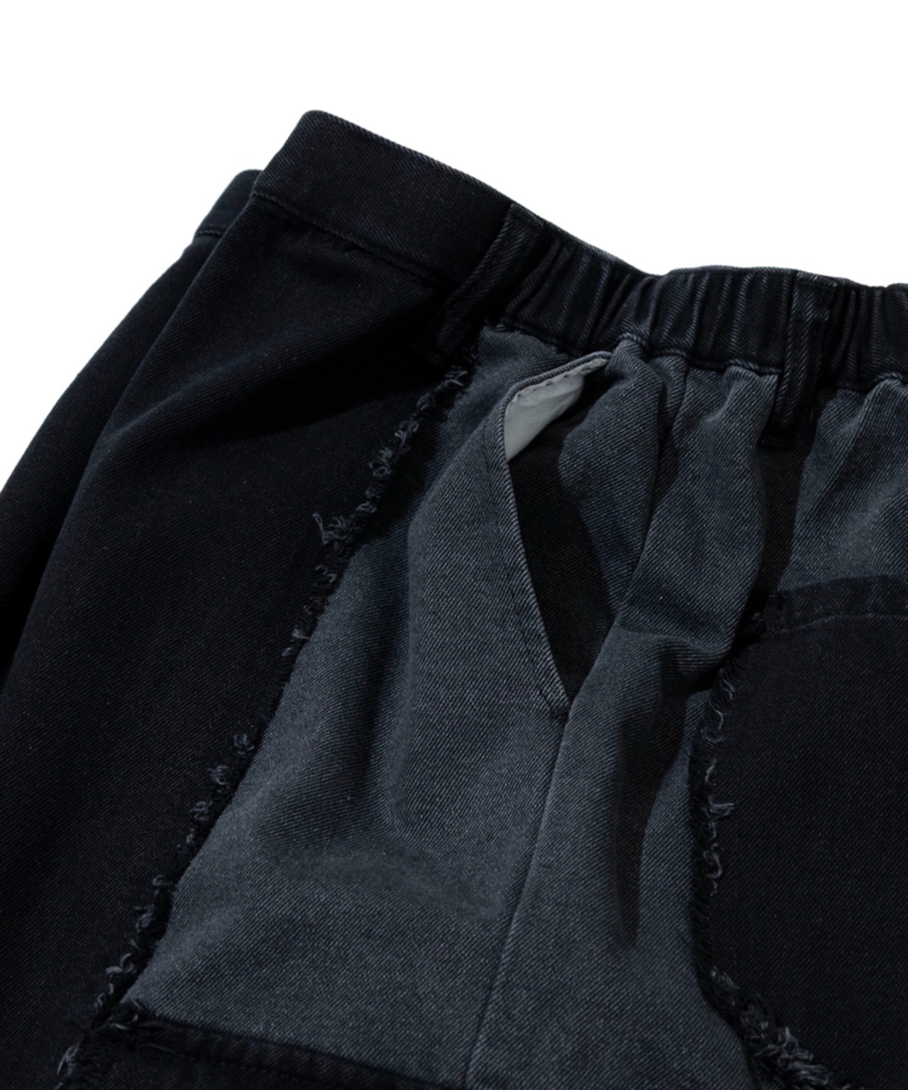 切り替え部分を断ち切り仕様にすることで、自然なフリンジのような表情を生み出し、ヴィンテージ感のある仕上がりに。ボリュームのあるシルエットながら、カジュアルからストリートまで幅広く取り入れられる一本です。