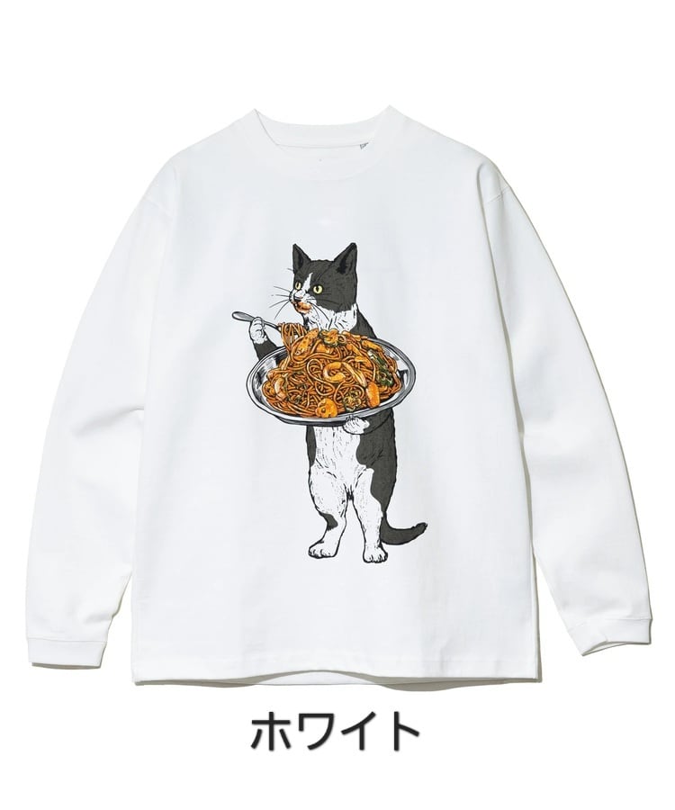 昔懐かし昭和喫茶のナポリタンを頬張るわんぱくなハチワレ猫。ヘビーなベーシックシルエットのロングスリーブT。バックサイドにはシリーズのオリジナルネームが付いています。
