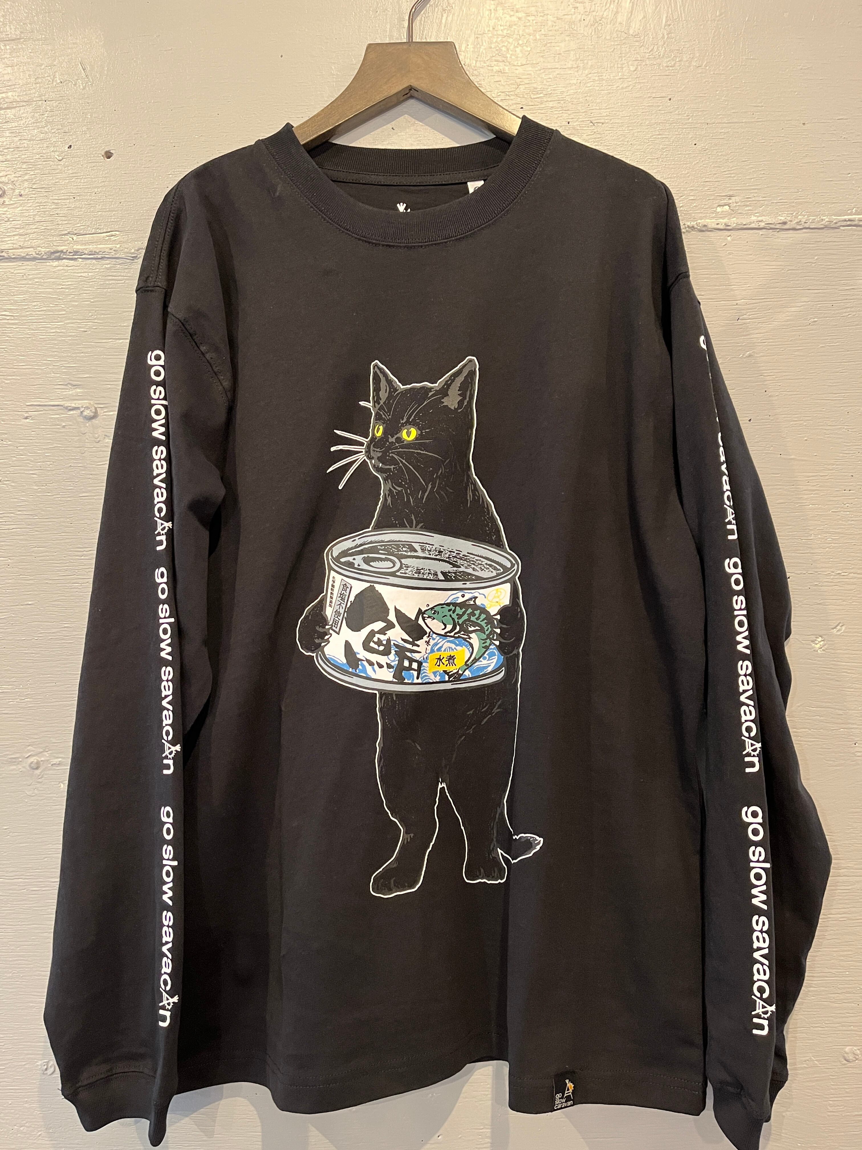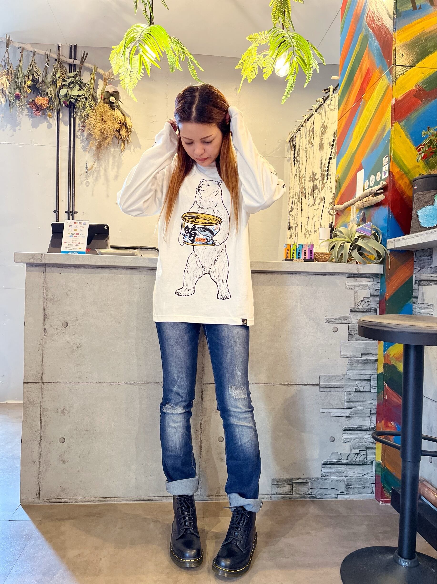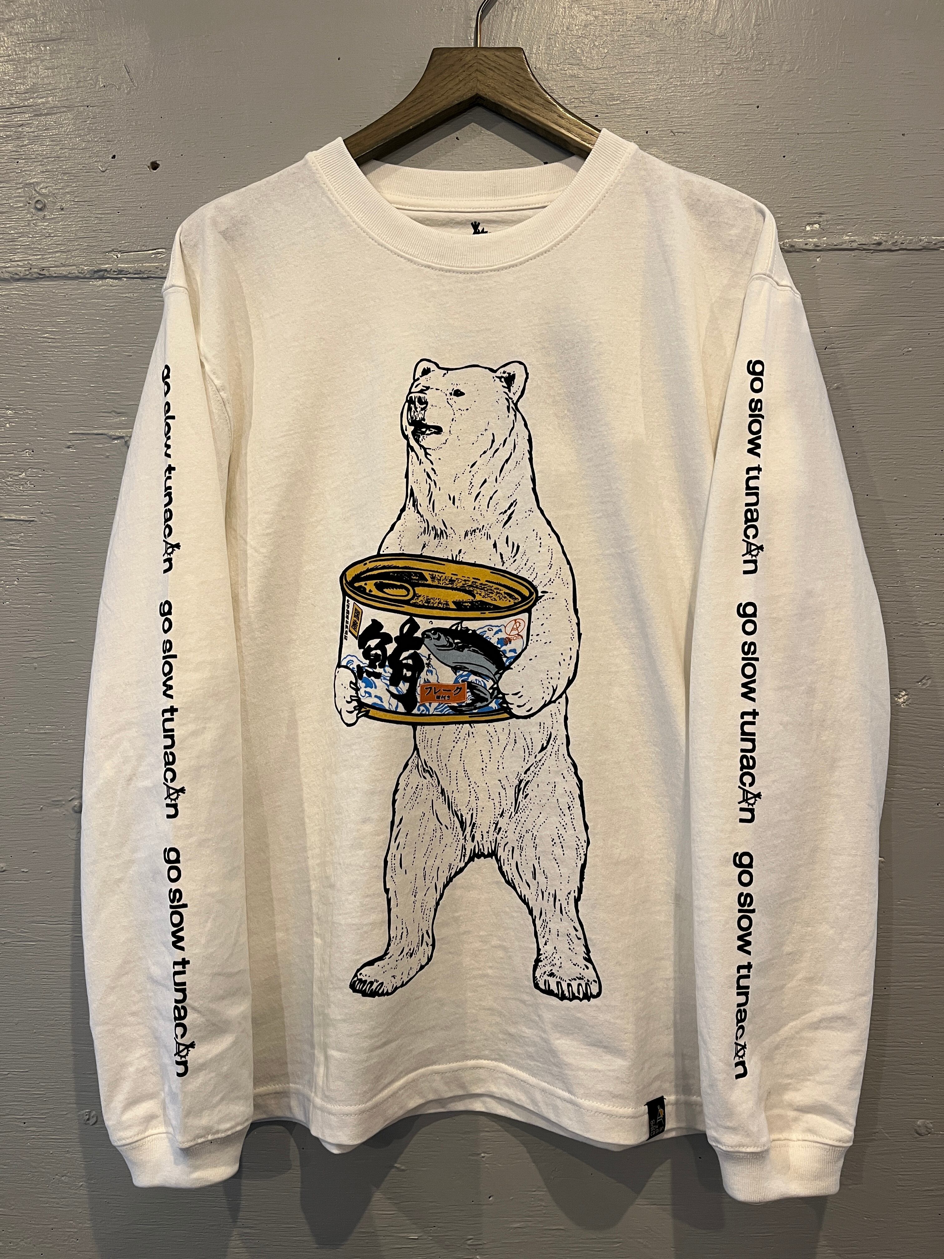 go slow caravan食品の缶詰を持ったクマとネコのプリント ロングスリーブTEE!