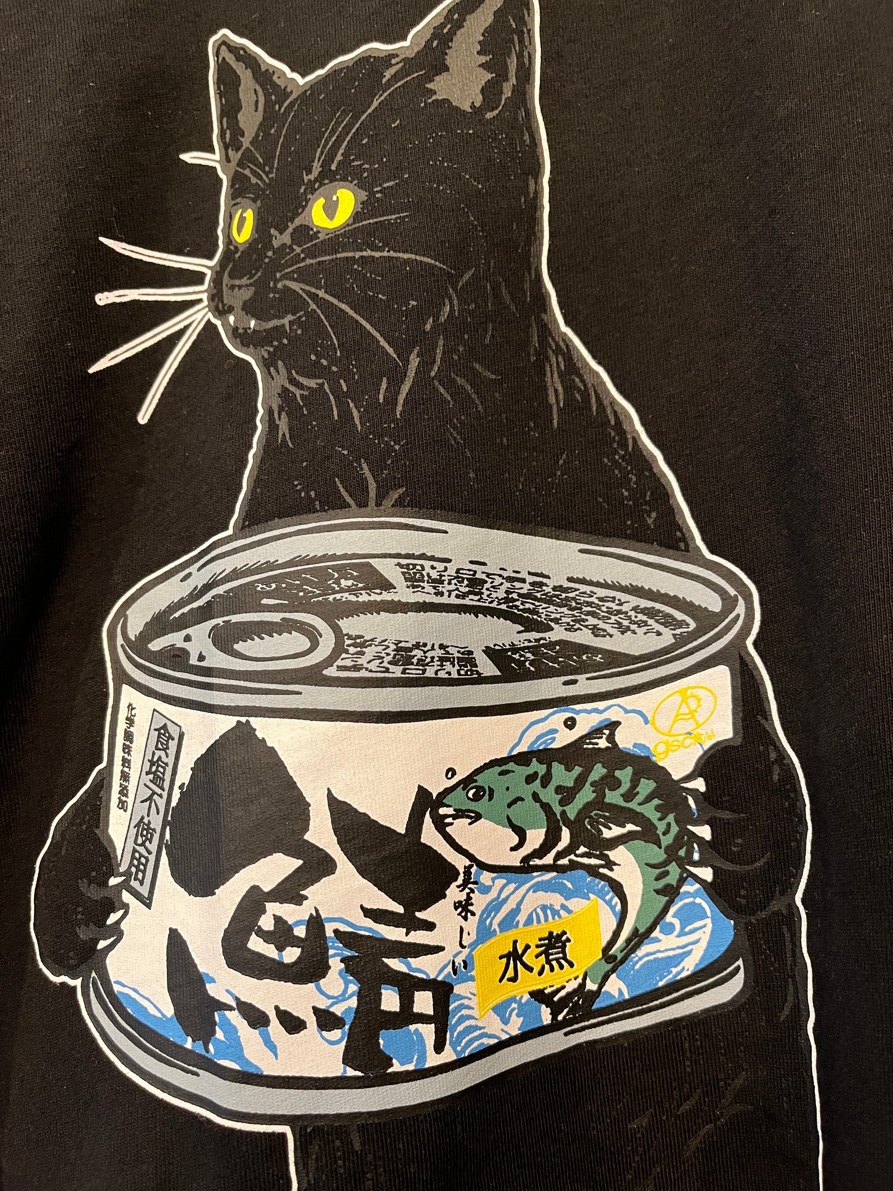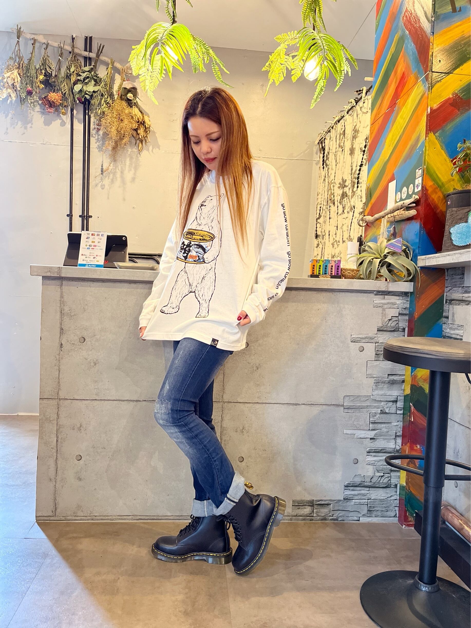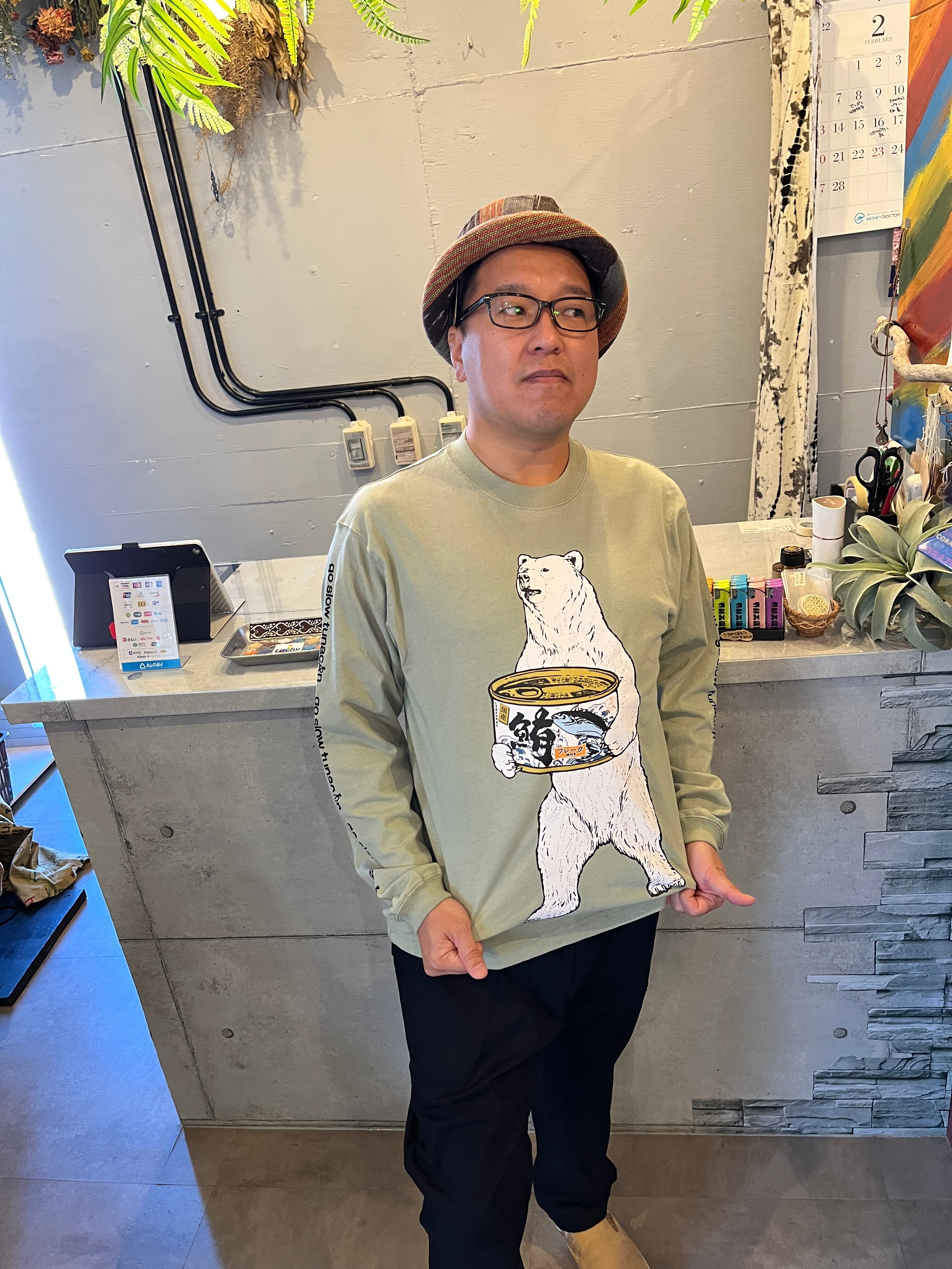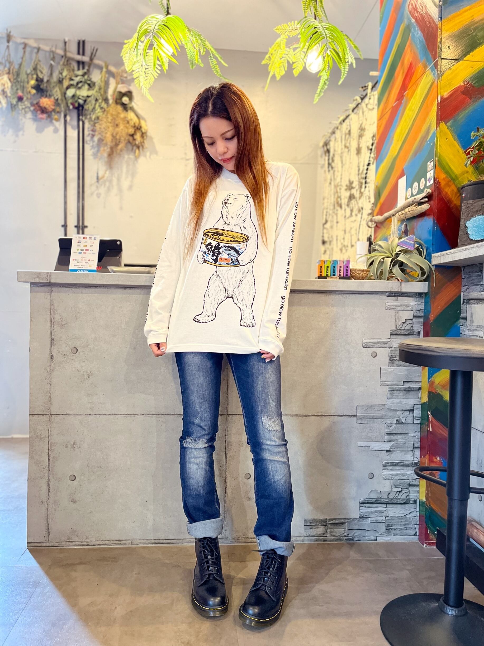 go slow caravan食品の缶詰を持ったクマとネコのプリント ロングスリーブTEE!