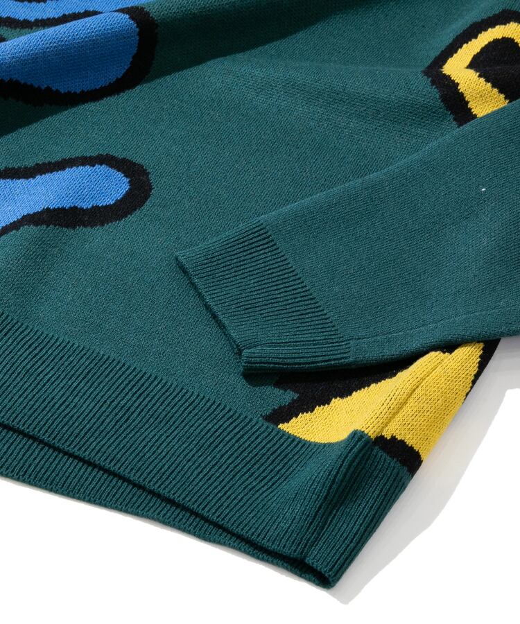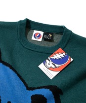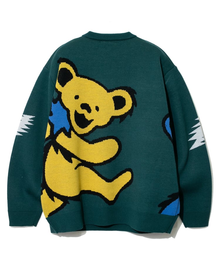 GRATEFUL DEADのアイコン《DANCING BEAR》をダブルジャガードで表現、前後で配色の違うDANCING BEARが大胆にデザインされ、両袖にはボルト柄も入ったリラックスサイジングのスペシャルなセーター。