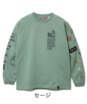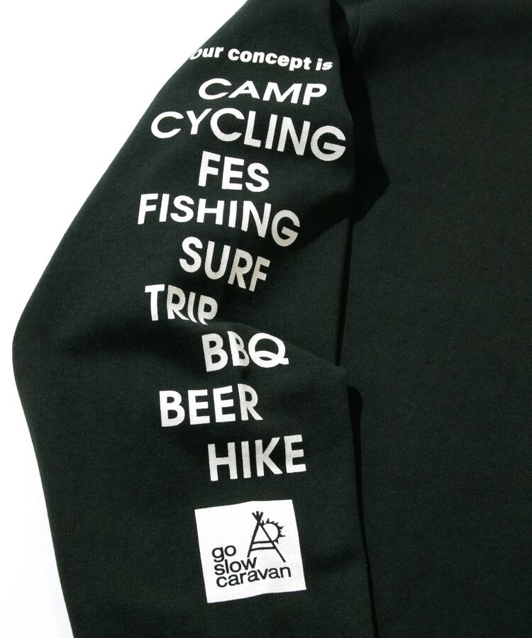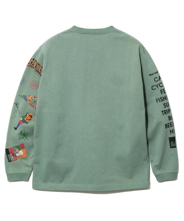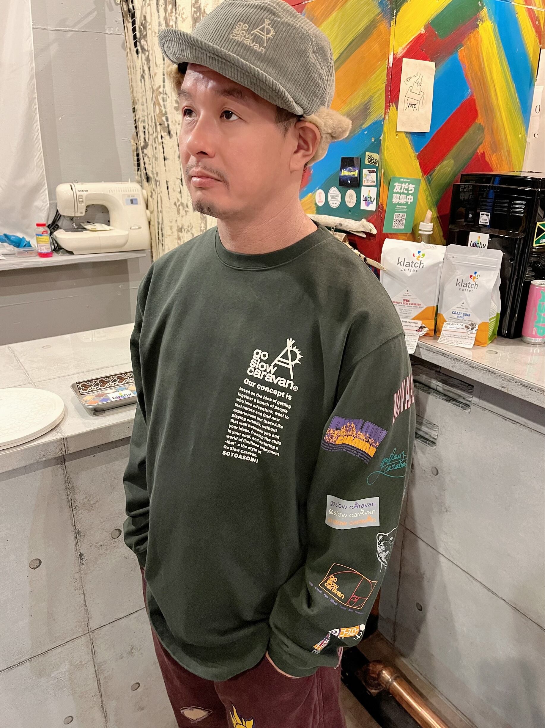 ゴースローキャラバンのテーマやモチーフを両袖にプリントで散りばめた気分の上がるアイテム。サイジングはベーシックなロングスリーブTです。