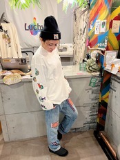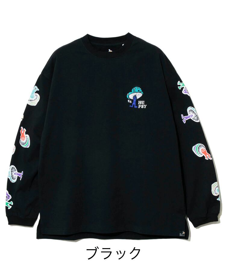 袖にカラフルなサイケキノコ達が並び、胸にはボディカラー毎に異なったキノコを刺繍。スリット入りのBIGロングスリーブT。