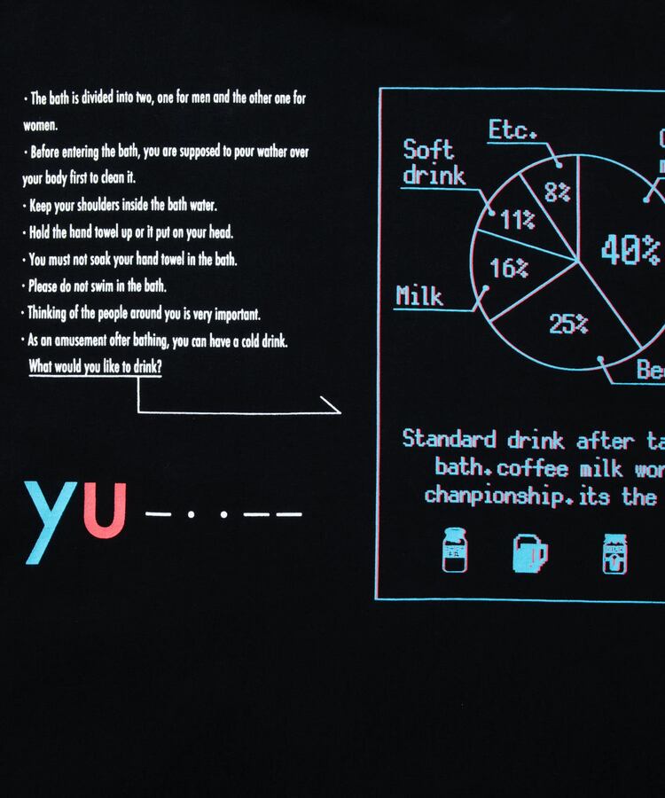インパクト抜群のスーパー銭湯ゆったりTEE。前身には「ゆ」背面には銭湯に関するデータをプリントした銭湯に着ていくしかない服。